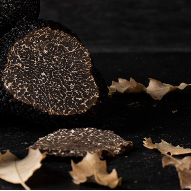 Der schwarze Trüffel, wissenschaftlich bekannt als Tuber melanosporum, wird wegen seiner einzigartigen organoleptischen Eigenschaften hoch geschätzt. Optisch weist er eine schwarze, warzige Oberfläche auf, die sein dunkelbraunes Inneres schützt, durchzogen von feinen weißen Adern. Seine Textur ist fest und leicht schwammig. Das Aroma des schwarzen Trüffel ist unverwechselbar intensiv und wird oft als erdig und moschusartig mit einer Nuance von Haselnuss beschrieben. Geschmacklich bietet er ein reiches und komplexes Profil mit Anklängen an Holz und Wild, was ihn zu einer exquisiten und in der Haute Cuisine geschätzten Zutat macht.